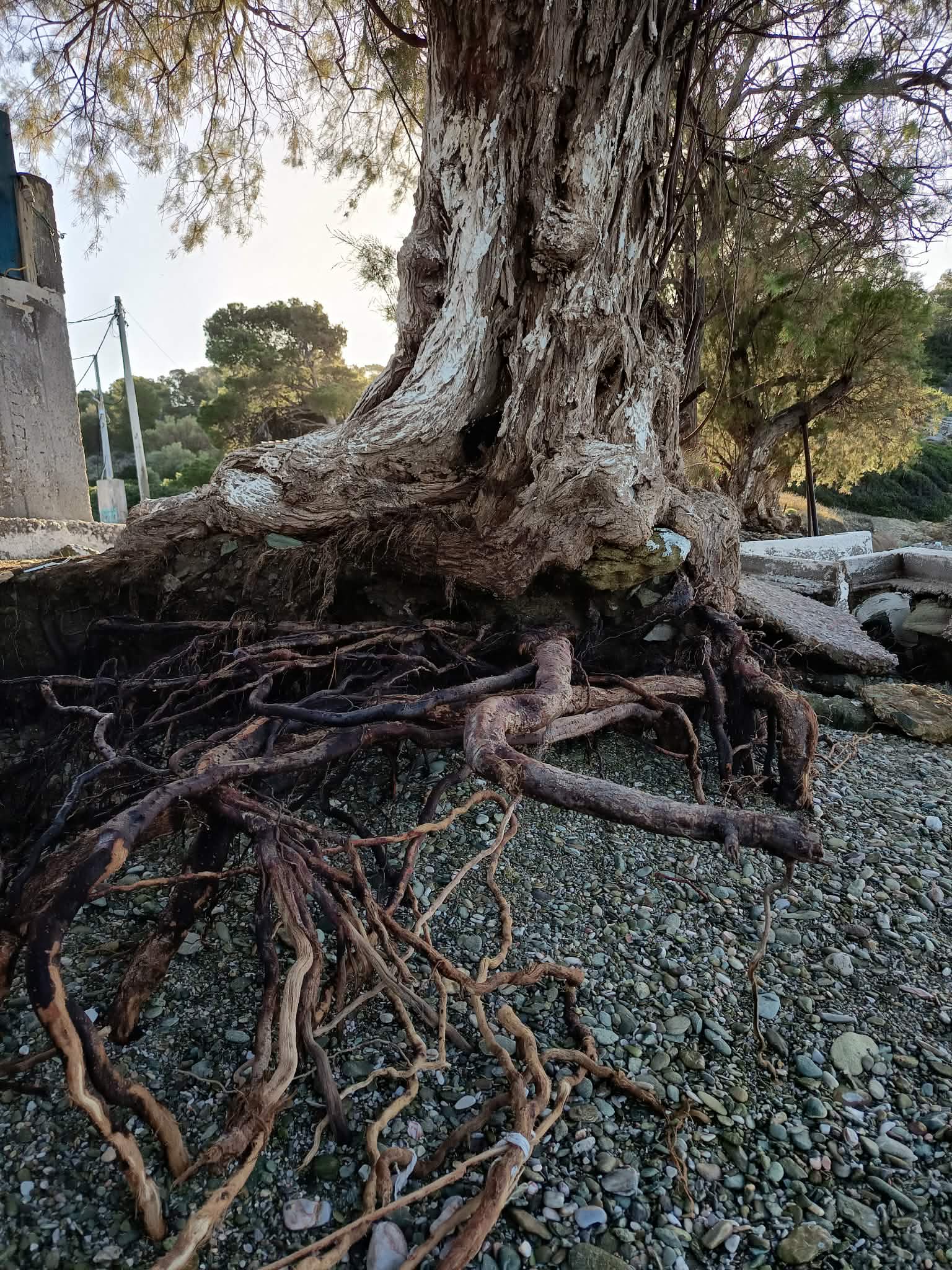 Στην παραλία στις Κολώνες τα θαλασσόδεντρα έχουν κυριολεκτικά ξεριζωθεί και ο κίνδυνος να πέσουν και να τραυματίσουν τους επισκέπτες και τους λουόμενους το καλοκαίρι είναι εμφανής.