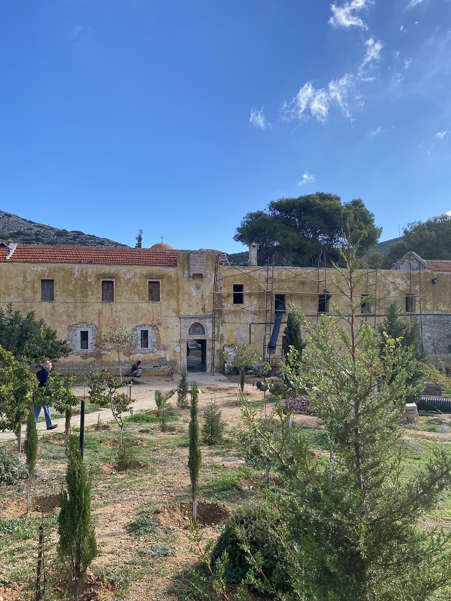 Στη Μονή Γουβερνέτου δε συναντήσαμε ορδές τουριστών με αποτέλεσμα να κυριαρχεί η απόλυτη σιωπή κατά την επίσκεψή μας παρά το γεγονός ότι κάποια μέρη της βρίσκονται στο στάδιο της αποκατάστασης.